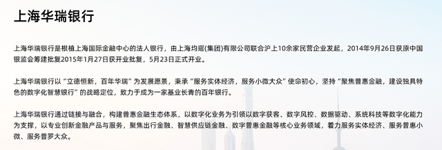 上海华瑞银行股份有限公司是根植上海国际金融中心的法人银行,由上海均瑶(集团)有限公司联合沪上10余家民营企业发起,2014年9月26日获原中国银监会筹建批复2015年1月27日获开业批复,5月23日正式开业。