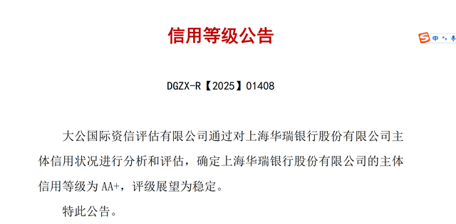 11月03日,中国外汇交易中心发布上海华瑞银行股份有限公司(下称:华瑞银行)2025年企业信用评级报告:大公国际资信评估有限公司确定华瑞银行的主体信用等级为AA+,评级展望为稳定。此前其信用评级为AA。
