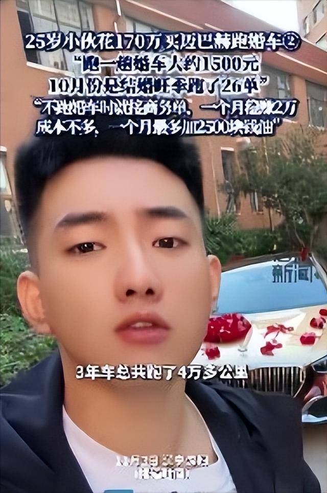 “3年一共跑了4万公里,10月份旺季总共跑了26趟(婚车),(单次大约)1500元,大小日子上下浮动500元。”冷鹤说不止跑婚车,自己跑商务也赚钱,一个月稳赚2万元,“成本不多,一个月最多加2500块钱油。”