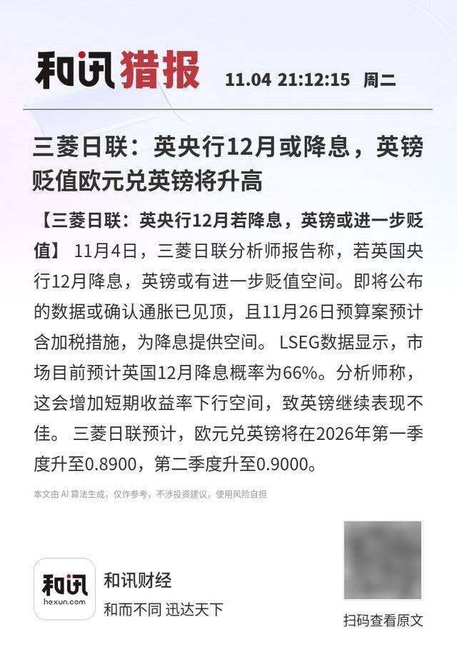 【三菱日联:英央行12月若降息,英镑或进一步贬值】11月4日,三菱日联分析师报告称,若英国央行12月降息,英镑或有进一步贬值空间。即将公布的数据或确认通胀已见顶,且11月26日预算案预计含加税措施,为降息提供空间。LSEG数据显示,市场目前预计英国12月降息概率为66%。分析师称,这会增加短期收益率下行空间,致英镑继续表现不佳。三菱日联预计,欧元兑英镑将在2026年第一季度升至0.8900,第二季度升至0.9000。