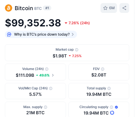 据CoinMarketCap平台报价,北京时间11月5日9时44分,比特币价格跌破10万美元,报99352.38美元,24小时跌幅超过7%。