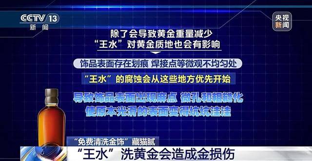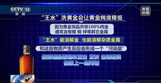 “王水”洗黄金也会让黄金纯度降低。因为黄金饰品并非100%纯金,通常含有银、铜、锌等其他金属。“王水”不仅能溶解金,也能溶解这些杂质金属。同时“王水”和这些物质产生反应会形成一个“污染层”。这使得饰品看起来发白、发灰、色泽暗淡,像蒙上了一层污垢。