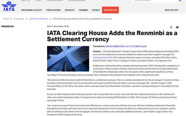 11月5日,据“航旅新零售”微信公众号,国际航协宣布,将新增人民币作为国际航协清算所(ICH)可供航空公司及其他供应商使用的结算货币之一。此前,国际航协清算所支持七种货币结算,包括美元、欧元、英镑、瑞士法郎、新加坡元、澳大利亚元和日元。