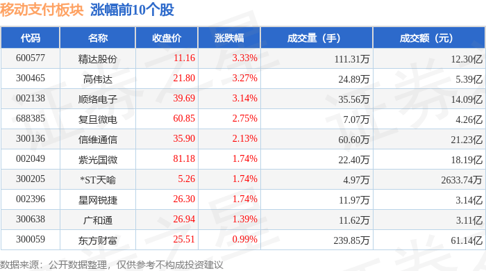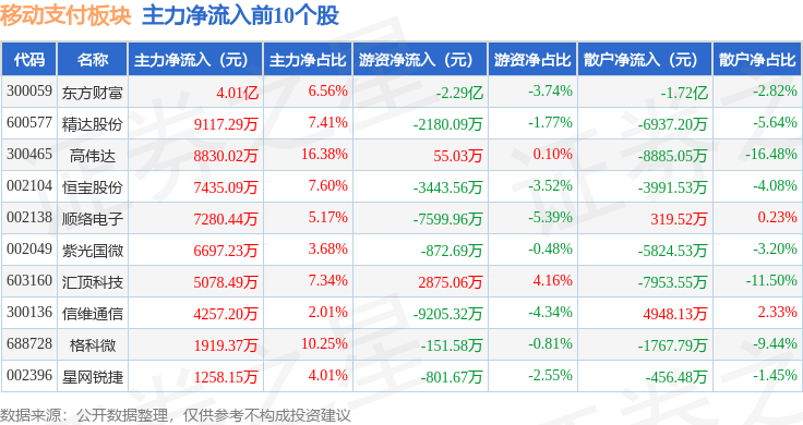 从资金流向上来看,当日移动支付板块主力资金净流入1.13亿元,游资资金净流出4.06亿元,散户资金净流入2.93亿元。移动支付板块个股资金流向见下表: