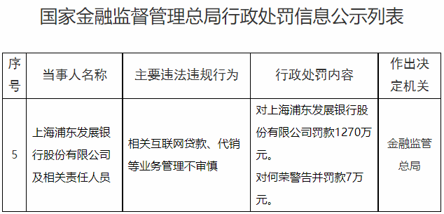 10月31日,国家金融监督管理总局公布行政处罚信息,上海浦东发展银行股份有限公司因相关互联网贷款、代销等业务管理不审慎,被处以罚款1270万元,相关责任人一并被警告并罚款7万元。