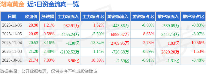 股票行情快报:湖南黄金(002... 证券之星消息,截至2025年11月6日收盘,湖南黄金(002155)报收于20.9元,上涨1.21%...