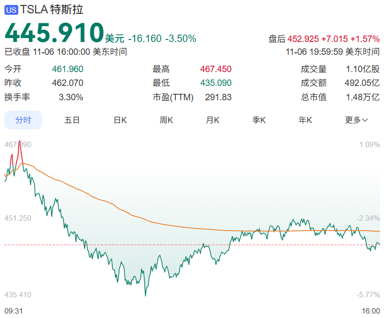 当地时间11月6日,受美股市场科技股集体走低拖累,特斯拉的股票跌逾3%。