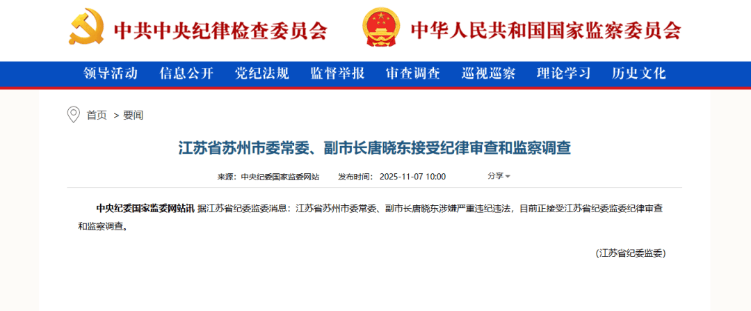 据江苏省纪委监委消息:江苏省苏州市委常委、副市长唐晓东涉嫌严重违纪违法,目前正接受江苏省纪委监委纪律审查和监察调查。