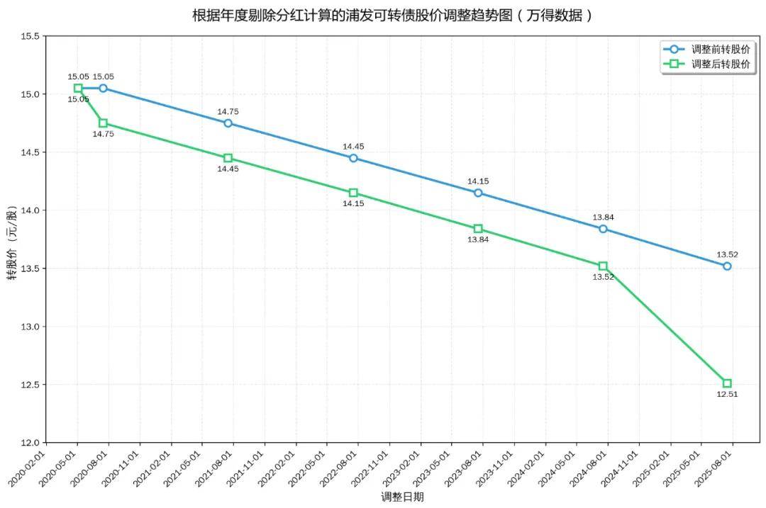 2019年11月,浦发银行发行500亿元浦发转债,初始转股价格为15.05元/股,后因年度利润分配调整至12.51元/股。