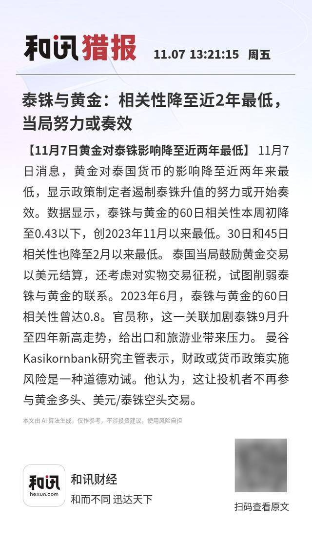 【11月7日黄金对泰铢影响降至近两年最低】11月7日消息,黄金对泰国货币的影响降至近两年来最低,显示政策制定者遏制泰铢升值的努力或开始奏效。数据显示,泰铢与黄金的60日相关性本周初降至0.43以下,创2023年11月以来最低。30日和45日相关性也降至2月以来最低。 泰国当局鼓励黄金交易以美元结算,还考虑对实物交易征税,试图削弱泰铢与黄金的联系。2023年6月,泰铢与黄金的60日相关性曾达0.8。官员称,这一关联加剧泰铢9月升至四年新高走势,给出口和旅游业带来压力。 曼谷Kasikornbank研究主管表示,财政或货币政策实施风险是一种道德劝诫。他认为,这让投机者不再参与黄金多头、美元/泰铢空头交易。