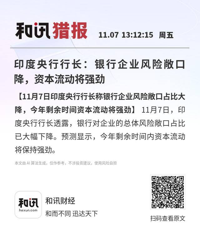 【11月7日印度央行行长称银行企业风险敞口占比大降,今年剩余时间资本流动将强劲】11月7日,印度央行行长透露,银行对企业的总体风险敞口占比已大幅下降。预测显示,今年剩余时间内资本流动将保持强劲。