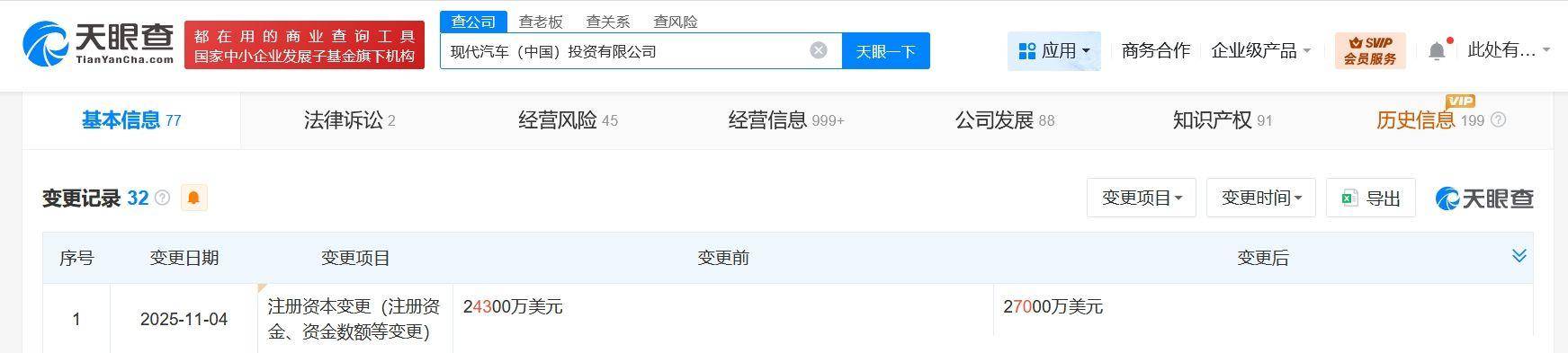 天眼查工商信息显示,近日,现代汽车(中国)投资有限公司发生工商变更,注册资本由2.43亿美元增至2.7亿美元,增幅约11%。