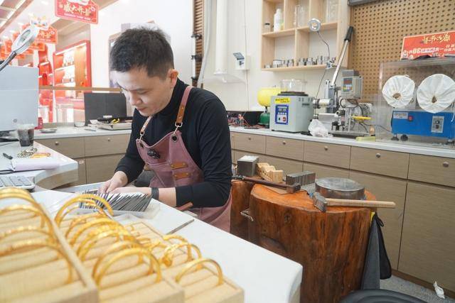 “打金师傅做一件基础款式,耗时基本相当,不管是做一个戒指还是一个手镯,都需要花费一个半小时到2个小时。” 蒋建东介绍说,一个打金师傅一天顶多能做三到五件首饰,而现在店里的订单排得满满当当,4个打金师傅从早上9点开门忙到晚上8点,连轴转才能跟得上进度。