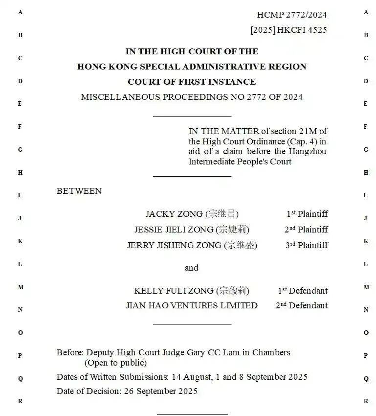 此次聆讯主要围绕被告方(即宗馥莉及Jian Hao)在8月1日法庭裁决之后提出的上诉申请展开。宗馥莉(宗庆后之女,娃哈哈集团董事长)方不服原裁决,于2025年8月15日提交传票并提出了五项上诉理由,包括法庭此前裁决所依据的香港《高等法院条例》第21M条是否适用、原告应先向内地法院申请类似救济、原告不存在可争辩的信托或财产权益、香港法院无需发出禁制令来提供担保,以及香港法院的披露令范围过宽且不适当等问题。