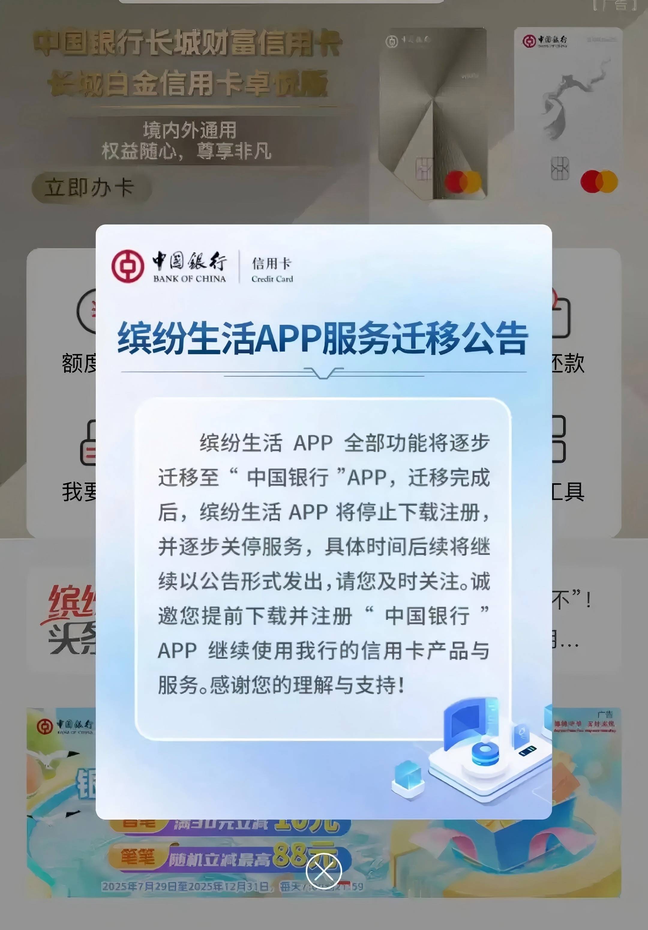 近日,中国银行信用卡中心发布公告称,将逐步关停旗下运营多年的信用卡APP“缤纷生活”,并将其全部功能逐步迁移至“中国银行”APP。除中国银行外,已有多家银行陆续对旗下APP进行整合。银行APP正迎来一波密集退场潮:从国有大行到城商行,这场手机银行APP的“瘦身运动”已席卷十余家银行。