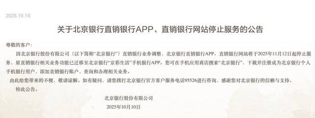 10月上旬,北京银行发布公告称,因直销银行业务调整,北京银行直销银行App、直销银行网站将于2025年11月12日起停止服务,原直销银行相关业务功能已迁移至北京银行“京彩生活”手机银行App。