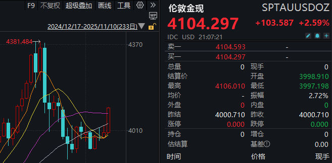【大河财立方消息】11月10日晚间,现货黄金突破4100美元/盎司,为10月27日以来首次,日内涨2.59%。