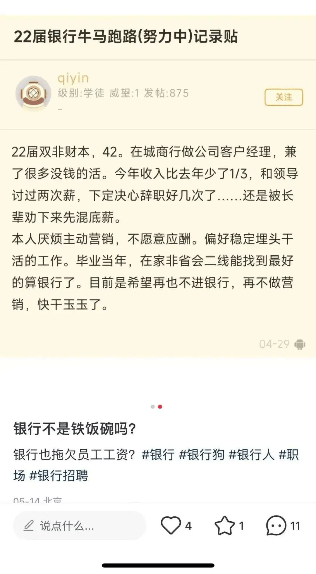 在小红书上也看到一些大行都只发基本工资了, 绩效都没有了,还有些银行可能连工资都发不出来了。