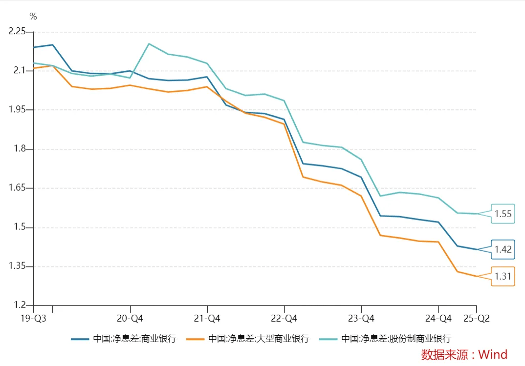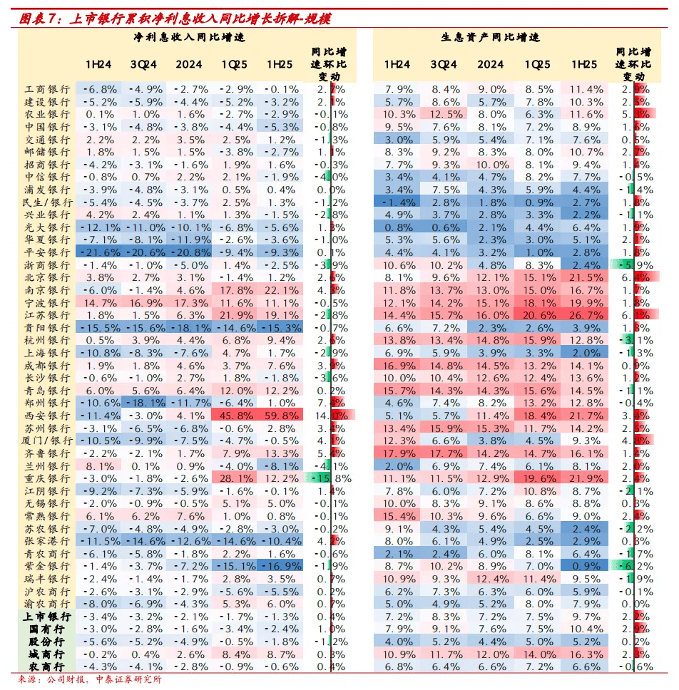 半年报数据显示,上半年,银行业净利息收入同比-1.3%(2024同比-1.7%),增速有所回升,但依旧是负增长。而且这个增速也是因为低基数的影响, 所以看着有所回升。