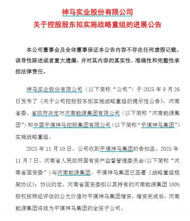 11月10日,神马股份发布关于控股股东拟实施战略重组的进展公告。2025年11月7日,河南省人民政府国有资产监督管理委员会与河南能源集团、平煤神马集团已签署《战略重组框架协议》;协议约定,河南省国资委拟以其持有的河南能源集团100%股权按照经评估的公允价值对平煤神马集团增资,增资完成后,河南能源集团将成为平煤神马集团的全资子公司。