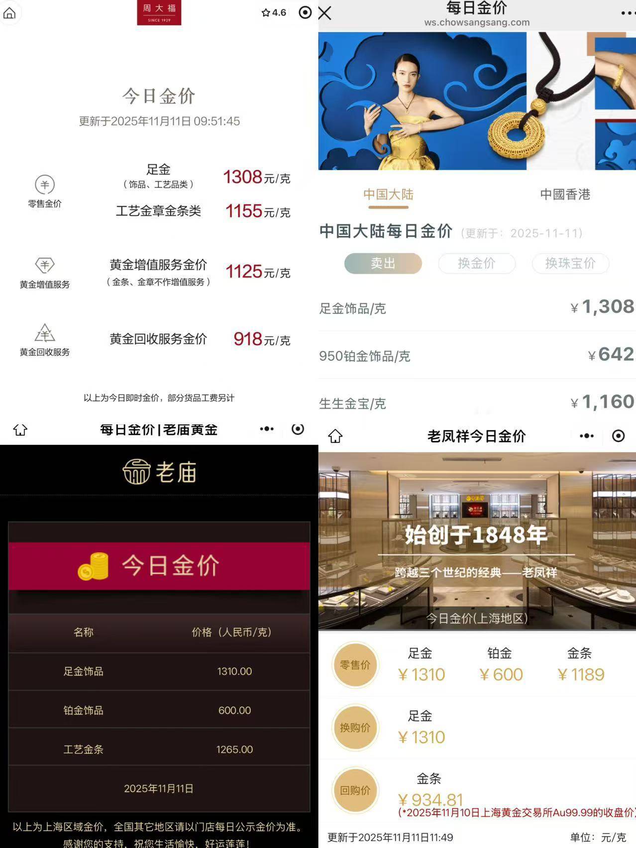 11月11日,国内黄金饰品价格对比显示,多家黄金珠宝品牌公布的境内足金首饰价格较昨日大幅上涨,多数涨幅近30元/克。周生生克价为1308元,周大福克价为1308元,老庙黄金上海区域克价为1310元,老凤祥克价为1310元,六福珠宝克价为1277元。