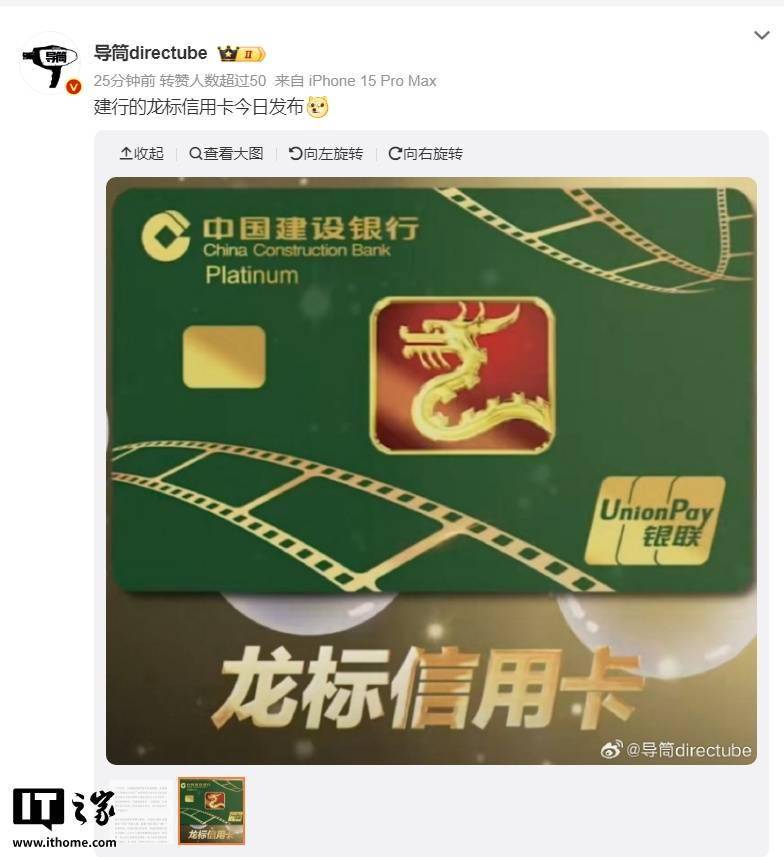 IT之家 11 月 11 日消息,据央视新闻报道,中国建设银行联合中国银联、大麦娱乐打造的龙卡龙标电影信用卡于今日在 2025 年金鸡百花电影节金鸡电影市场启动仪式上发布。