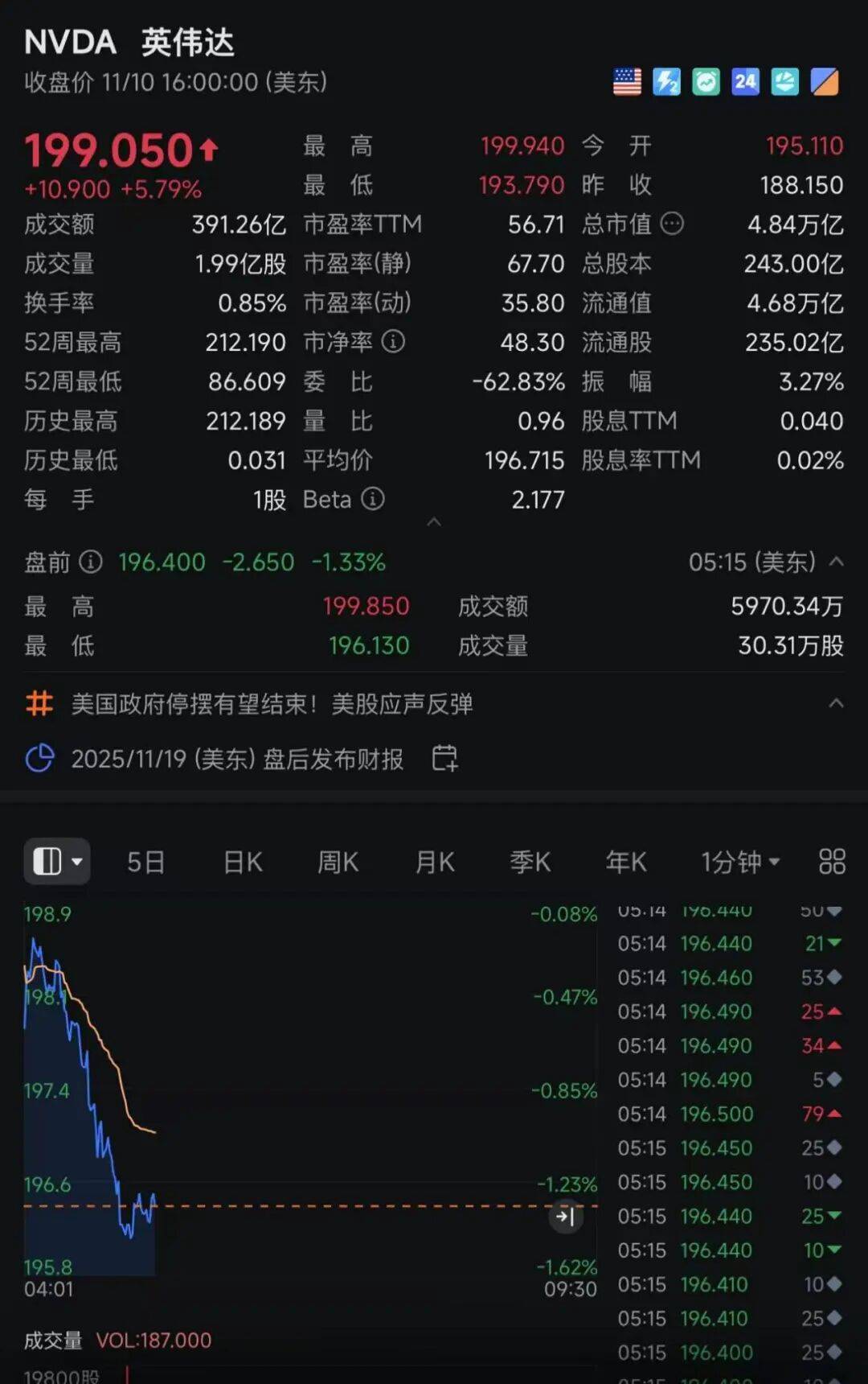 截至发稿,英伟达盘前股价一路走低,离跌破196美元/股仅一步之遥。而就在上月底,英伟达股价升破210美元/股,创历史新高,市值一度突破5万亿美元,成为历史上首个跨过这一门槛的公司。