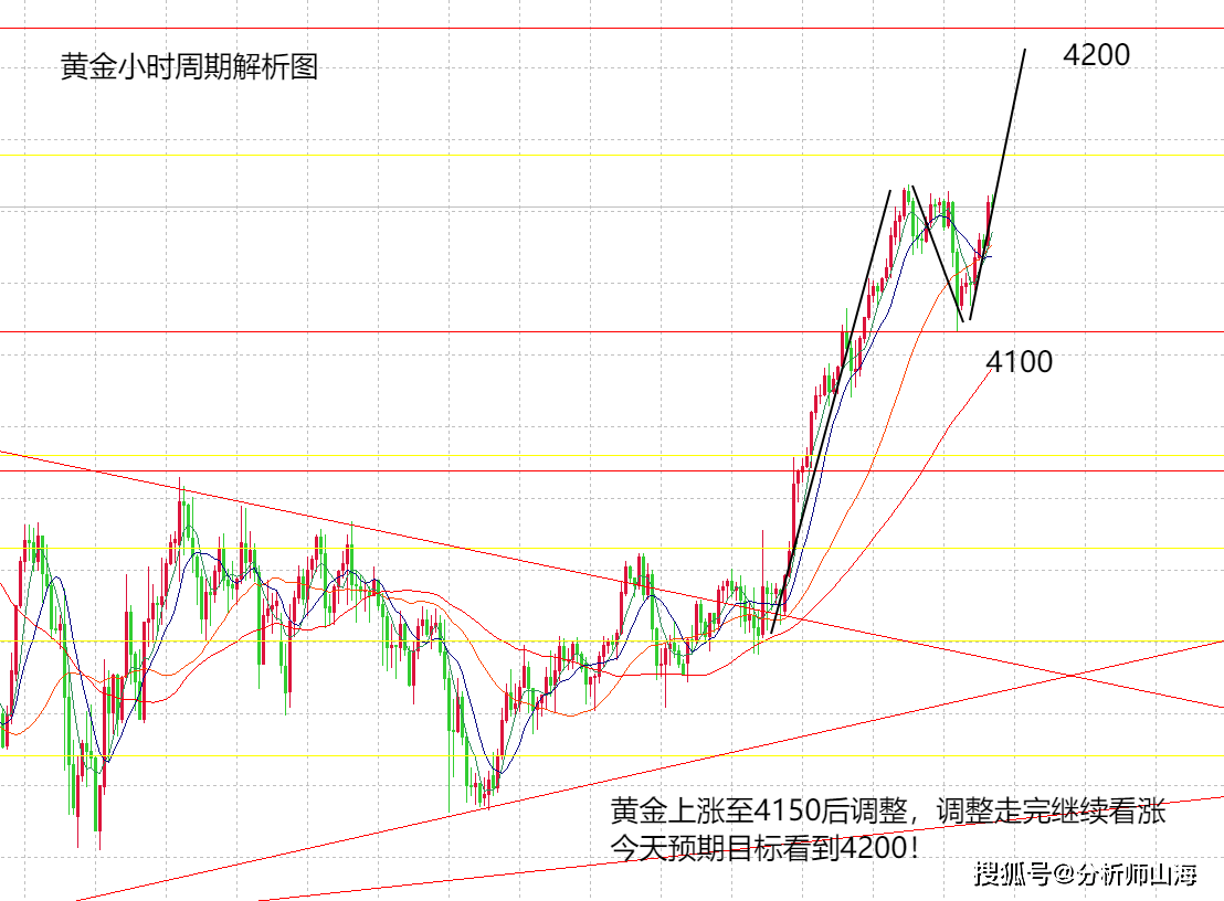 这波黄金的多头从3900就开始提示大家布局多单看涨,截至到目前为止,上涨力度已经达到山海预期的第一目标点4150,那么,下一波的上涨第二目标点4300。经过周二美盘的调整,大家可以看到,回落至4100后无力,基本形成第二阶段的上涨支撑点,在这个平台内,黄金可以继续上涨,技术面就看到日线周期布林上轨压制点4300附近,H4周期的表现也符合单边行情的走势,经过回落调整,k线还是收在均线之上,那么,日内上涨的高点至少要试探布林上轨的压制点4200附近,所以,今天阶段性的上涨可以先看到4200附近,如果周四,周五延续上涨的话,再看4300高点。对于小周期而言,4100已经形成强势支撑,那么,下方的支撑点现在可以调整至4125附近,日内回落至此点位可考虑继续做多看涨,同样的节奏,亚欧盘看涨,美盘开盘后看是否有较大的调整力度,调整力度过大还可以接多,调整力度不大连续到午夜盘继续看涨。