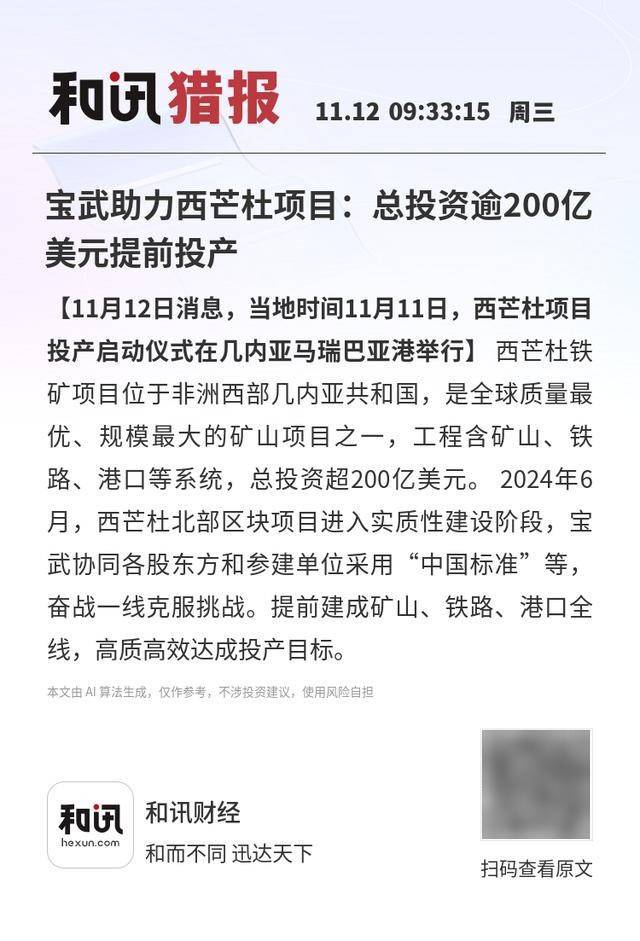 【11月12日消息,当地时间11月11日,西芒杜项目投产启动仪式在几内亚马瑞巴亚港举行】西芒杜铁矿项目位于非洲西部几内亚共和国,是全球质量最优、规模最大的矿山项目之一,工程含矿山、铁路、港口等系统,总投资超200亿美元。 2024年6月,西芒杜北部区块项目进入实质性建设阶段,宝武协同各股东方和参建单位采用“中国标准”等,奋战一线克服挑战。提前建成矿山、铁路、港口全线,高质高效达成投产目标。