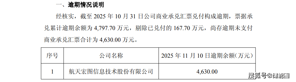航天宏图信息技术股份有限公司公告,公司此前因商业承兑汇票兑付问题构成逾期,截至2025年10月31日累计逾期余额为4797.7万元,已兑付167.7万元,尚存未支付金额为4630万元。