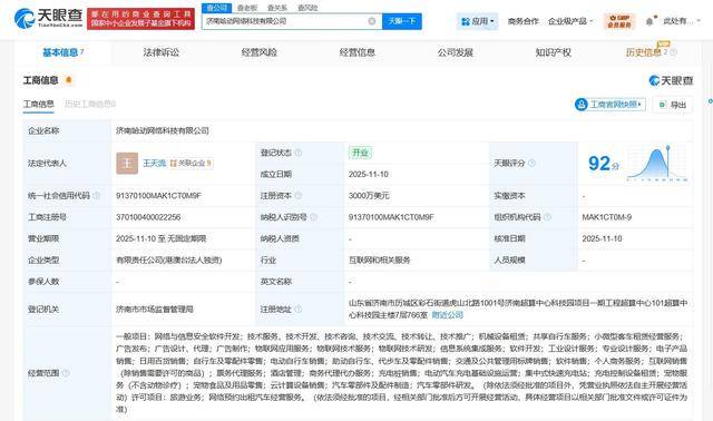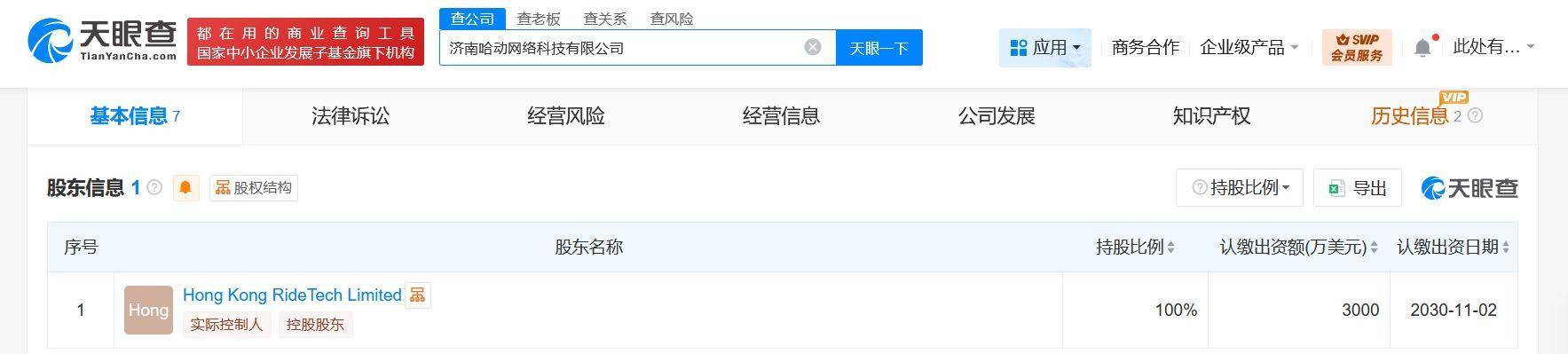 天眼查工商信息显示,近日,济南哈动网络科技有限公司成立,法定代表人为王天流,注册资本3000万美元,经营范围含网络与信息安全软件开发、物联网应用服务、物联网技术服务、信息系统集成服务、软件开发、互联网销售、票务代理服务、酒店管理、商务代理代办服务等。股东信息显示,该公司由哈啰出行旗下Hong Kong RideTech Limited全资持股。