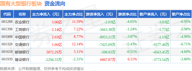 从资金流向上来看,当日国有大型银行板块主力资金净流入11.17亿元,游资资金净流出3.48亿元,散户资金净流出7.69亿元。国有大型银行板块个股资金流向见下表: