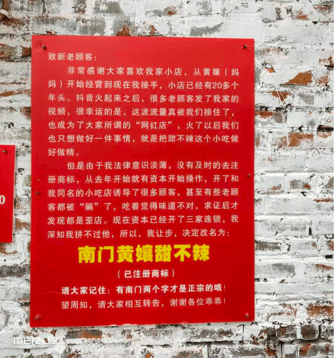 几个月前,在成都营业超20年的老店“黄嬢甜不辣”宣布改名,将原店名“黄嬢甜不辣”改为“南门黄嬢甜不辣”。在公告中,店主黄嬢的儿子王嘉琛将改名原因解释为:“法律意识淡薄,没有及时注册商标,从去年开始就有资本操作,开了和我们同名的小吃店诱导了很多顾客。”