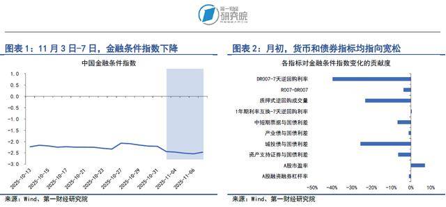 在2025年11月3日至11月7日当周,第一财经研究院中国金融条件日度指数均值为-2.49,较前一周下降0.34。从指数的分项指标来看,月初银行间市场流动性放松,带动指数下行。从货币指标来看,隔夜回购利率和7天回购利率同步下降。从债券指标来看,信用债收益率和信用利差同步回落。从股市指标来看,上周A股市盈率和杠杆融资水平同步下降。