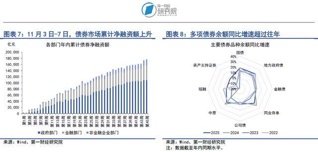 从债券余额增速来看,今年多项债券余额同比增速超过往年同期。截至11月7日,政府部门债券余额同比增速为19.1%,较2024年同期增速上升3.8个百分点;金融部门债券余额同比增速为12%,较2024年同期增速上升0.2个百分点;非金融企业部门债券余额同比增速为7.3%,较2024年同期增速上升4.3个百分点。
