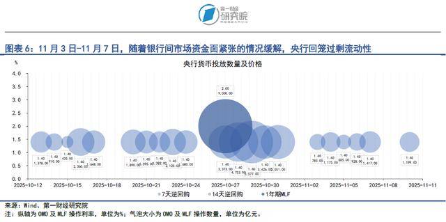 11月第一周,随着银行间市场资金面紧张的情况缓解,央行回笼多余流动性。在11月3日至11月7日当周,央行共通过7天逆回购投放资金4958亿元,共有2.07万亿元的逆回购到期,央行净投放资金1.57万亿元。