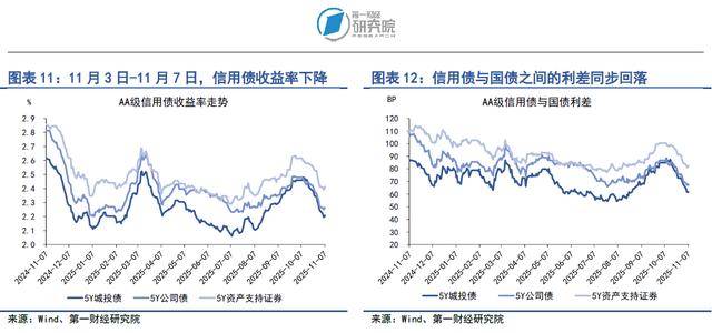 在11月3日至11月7日当周,多数品种信用债收益率明显下行。在AAA级债券中,5年期城投债、公司债和资产支持证券收益率分别下降8.46BP、6.8BP和7.03BP。在AA级债券中,5年期城投债、公司债和资产支持证券收益率分别下降7.86BP、5.83BP和5.86BP。