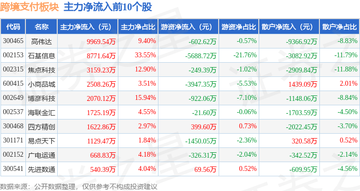 从资金流向上来看,当日跨境支付板块主力资金净流出2.37亿元,游资资金净流出1.18亿元,散户资金净流入3.55亿元。跨境支付板块个股资金流向见下表: