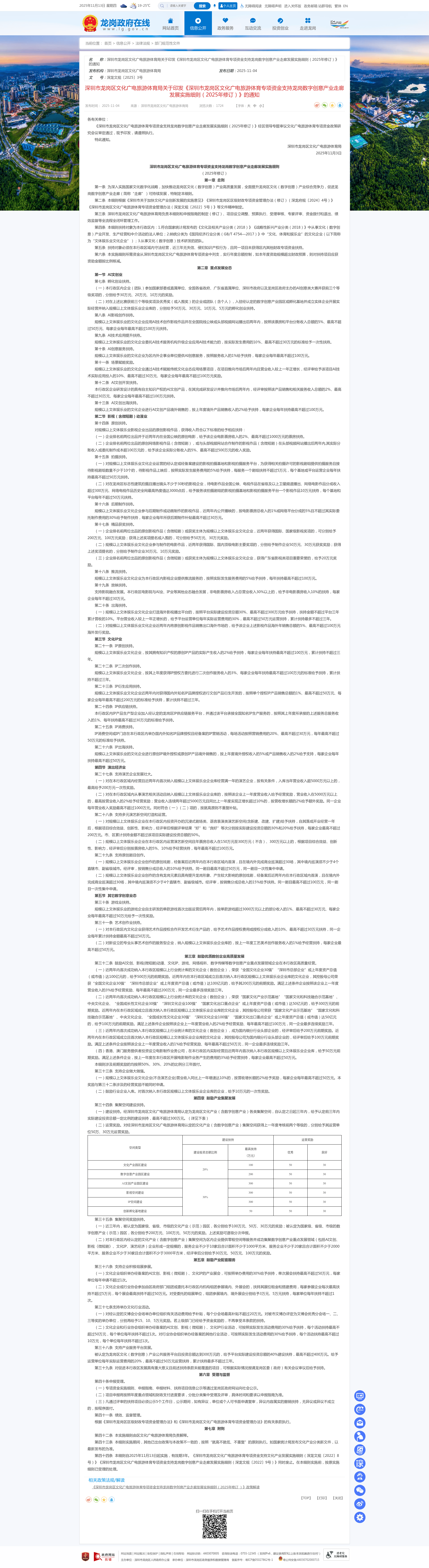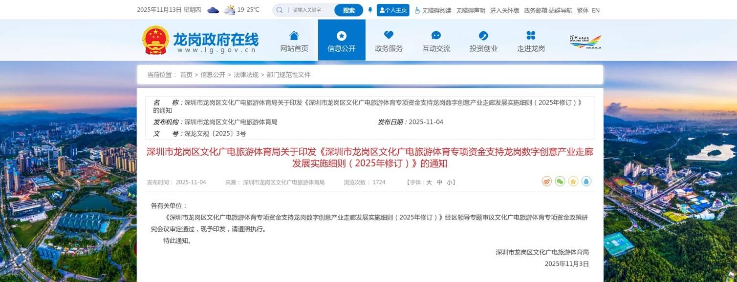 记者从深圳市龙岗区文化广电旅游体育局获悉,《深圳市龙岗区文化广电旅游体育专项资金支持龙岗数字创意产业走廊发展实施细则(2025年修订)》已于2025年11月13日起正式施行。