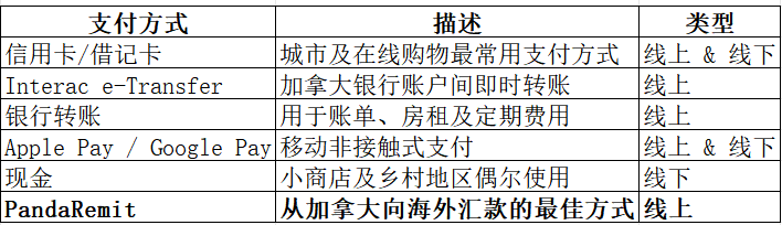 加拿大经济多样化且数字化程度高,因此多种支付方式满足不同需求。城市地区以卡支付和移动支付为主,现金使用频率较低。在跨境汇款方面,PandaRemit 比传统银行更快捷、经济,是理想选择。