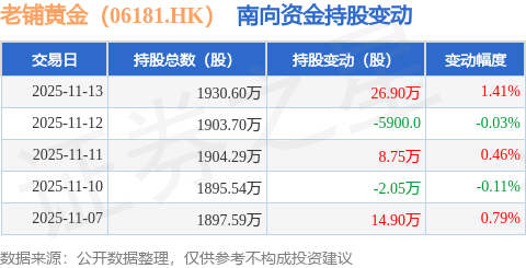 证券之星消息,11月13日南向资金增持26.9万股老铺黄金(06181.HK)。近5个交易日中,获南向资金增持的有3天,累计净增持47.91万股。近20个交易日中,获南向资金减持的有9天,累计净减持2.02万股。截至目前,南向资金持有老铺黄金(06181.HK)1930.6万股,占公司已发行普通股的13.47%。