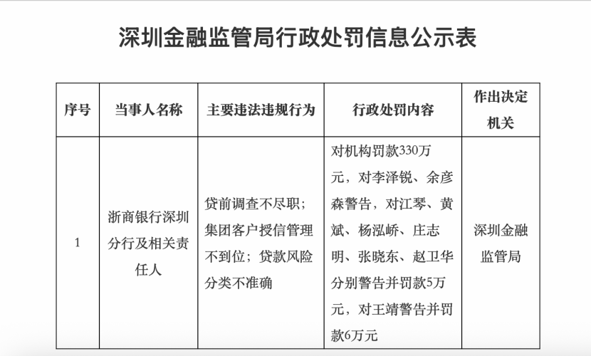 11月13日,深圳金融监管局披露的行政处罚信息公开表显示,浙商银行深圳分行及相关责任人因贷前调查不尽职;集团客户授信管理不到位;贷款风险分类不准确,被深圳金融监管局对机构罚款330万元。