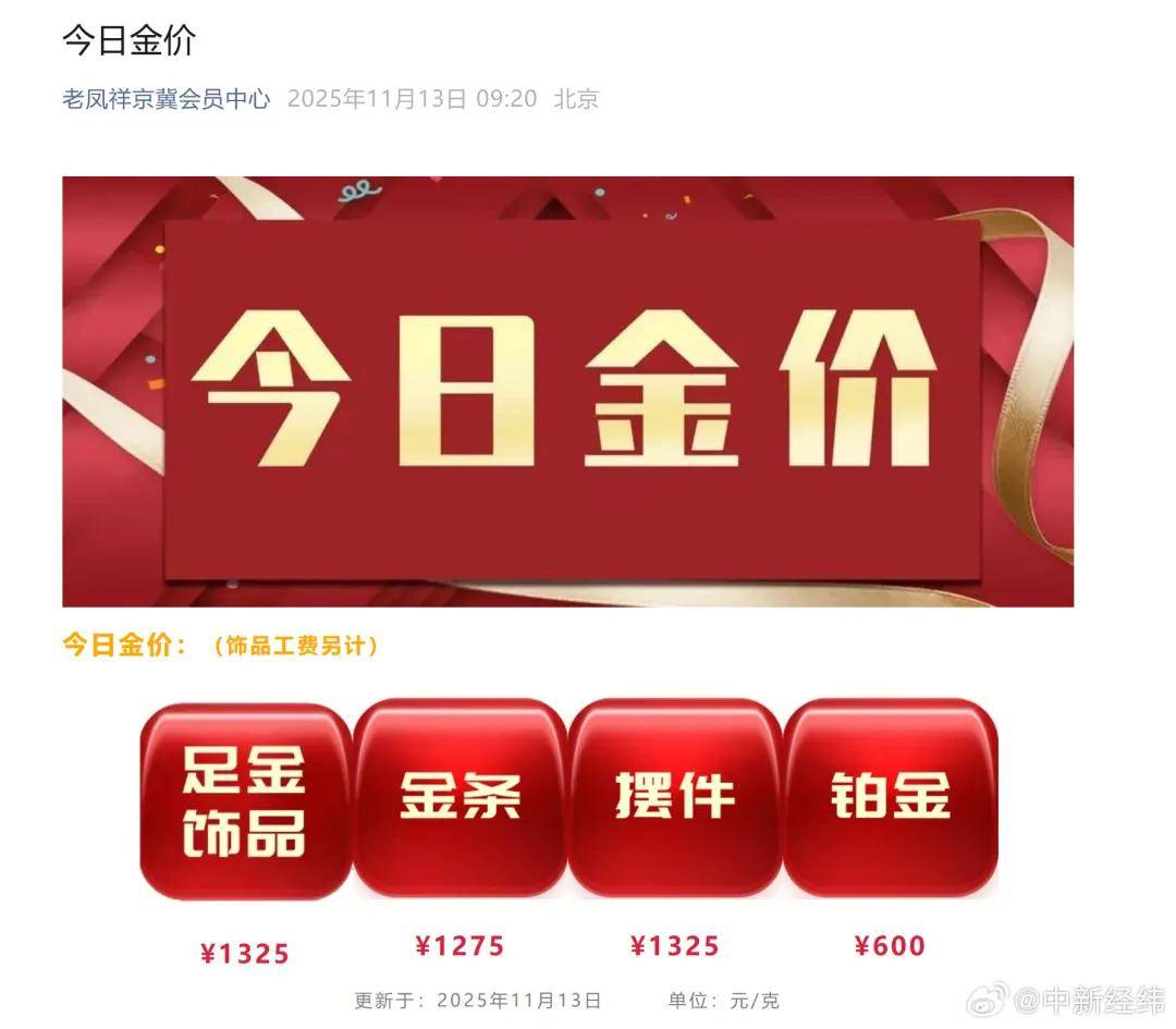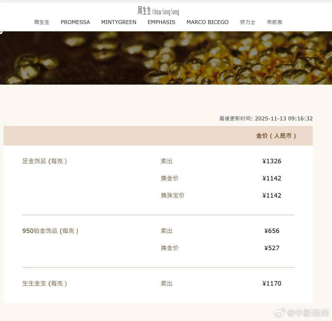 金饰价格方面,11月13日,周生生金饰价格为1326元/克,较前一日1309元/克上涨17元/克。 老庙黄金金饰价格为1325元/克,较前一日1310元/克上涨15元/克。老凤祥金饰价格为1325元/克,较前一日1310元/克上涨15元/克。