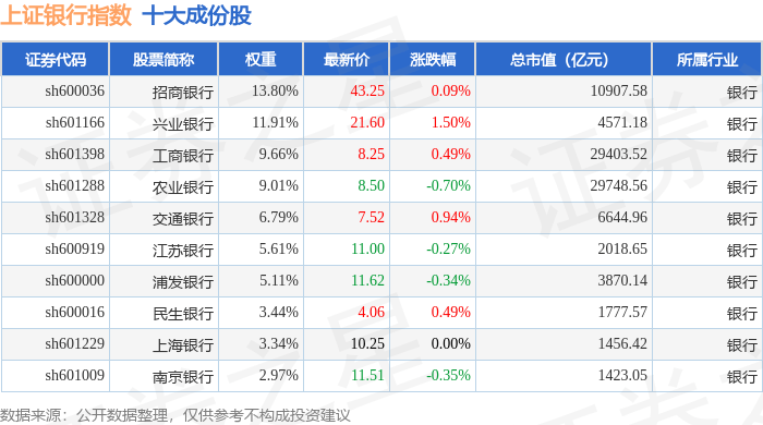 证券之星消息,11月14日,上证银行(000134)指数报收于1076.24点,涨0.29%,成交278.12亿元,换手率0.29%。当日该指数成份股中,上涨的有13家,兴业银行以1.5%的涨幅领涨,下跌的有9家,农业银行以0.7%的跌幅领跌。