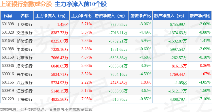 资金流向方面,上证银行(000134)指数成份股当日主力资金净流入合计3.13亿元,游资资金净流出合计4.32亿元,散户资金净流入合计1.19亿元。成份股资金流向详情见下表: