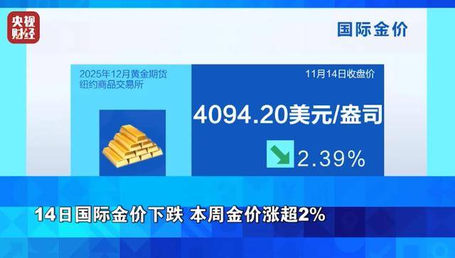 投资者对美联储降息的预期减弱拖累黄金价格下跌,截至收盘,纽约商品交易所12月黄金期价收于每盎司4094.20 美元,跌幅为2.39%。不过,由于前期涨幅较大,本周国际金价累计上涨2.10%。