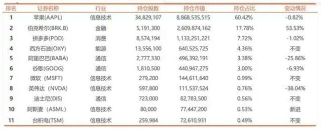 核心持仓明细方面:苹果是第一大重仓股,持仓市值88.69亿美元,占组合比例60.42%;伯克希尔B股市值26.1亿美元,以17.78%的占比位居第二;拼多多以11.33亿美元持仓位列第三;后续依次为西方石油(6.4亿美元)、阿里巴巴(近5亿美元)、谷歌(4.4亿美元),而新持仓的阿斯麦金额为7745万美元,占组合比例0.53%。