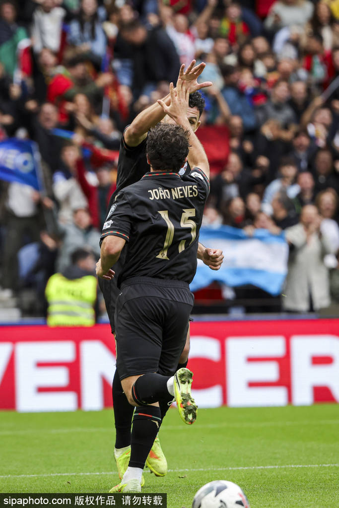 第81分钟,B费禁区左侧传中,菲利克斯后点头球顶向中路,坎塞洛伸腿蹭到皮球但未改变皮球方向,若昂-内维斯小禁区前凌空射门上演帽子戏法,葡萄牙主场8-1领先亚美尼亚。