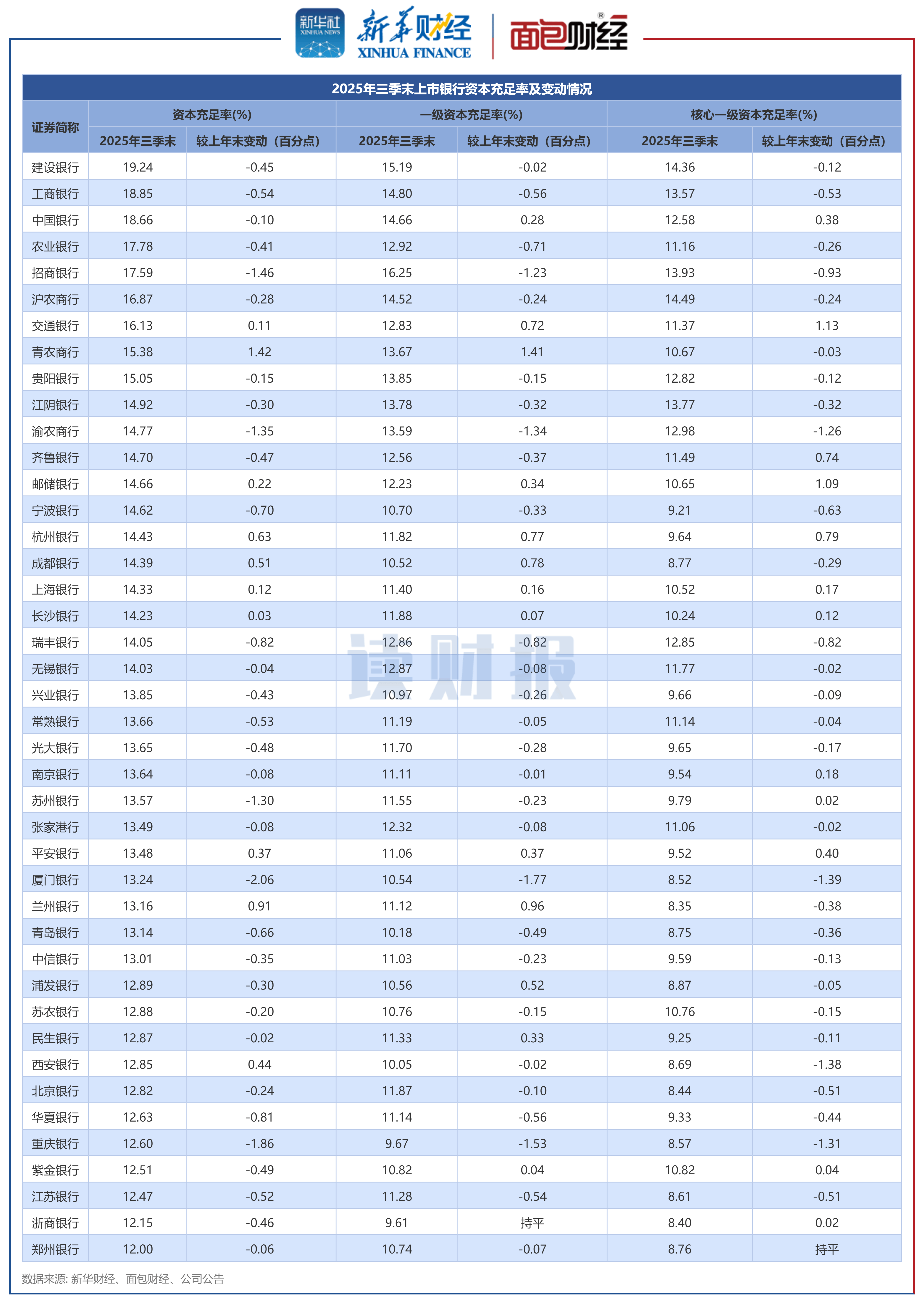 数据显示,截至2025年9月末,上市银行的资本充足率指标普遍出现下降。
