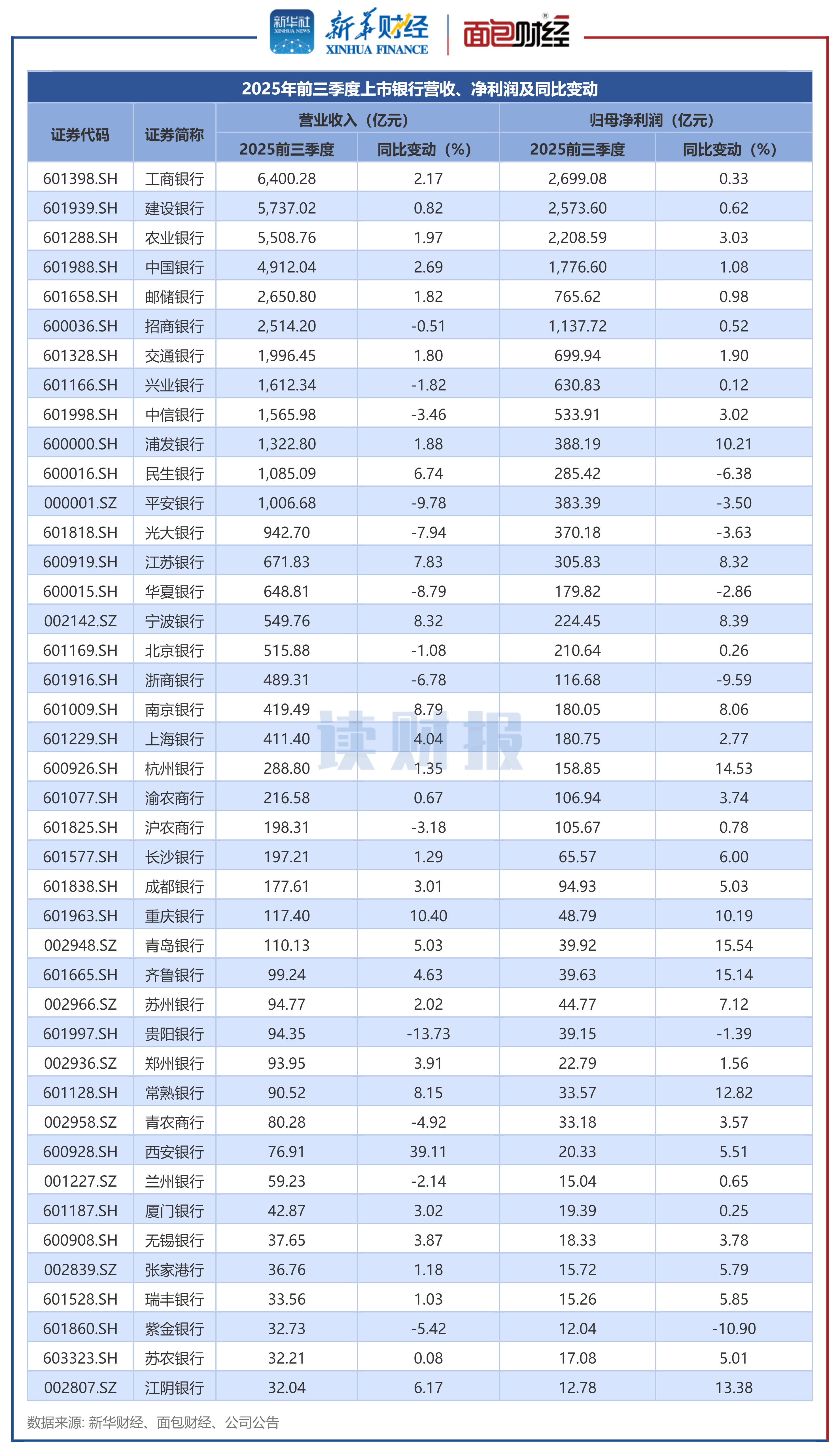 近期,随着2025年三季报披露结束,新华财经及面包财经研究员对A股42家上市银行业绩及核心监管指标进行了整理。